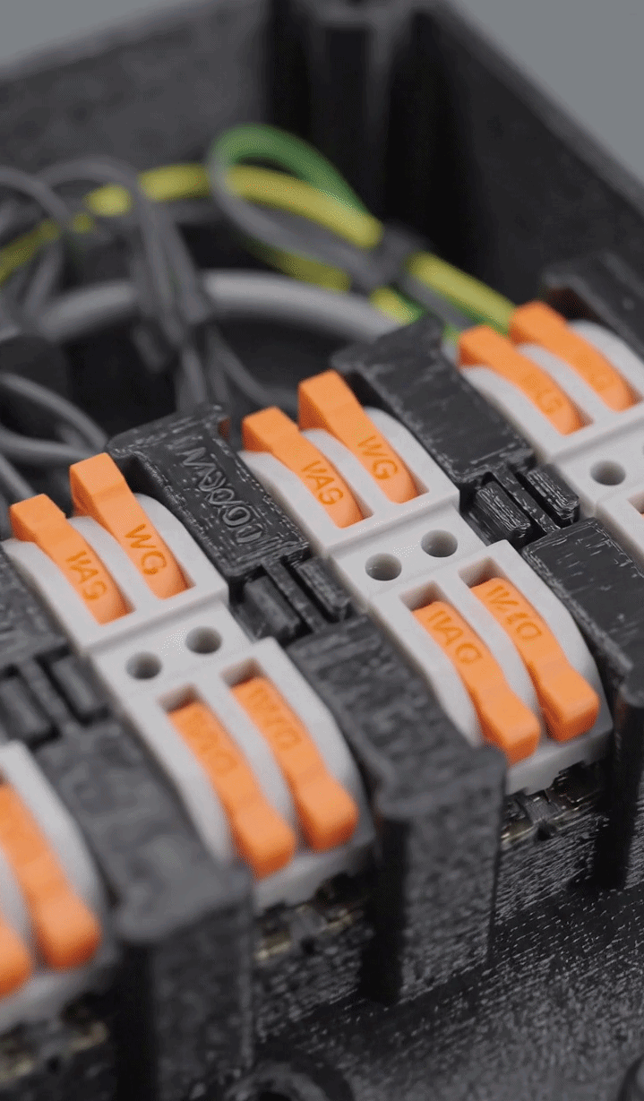 A fully custom 3D printed electrical junction box focusing on organization, efficiency, and installation aesthetics.